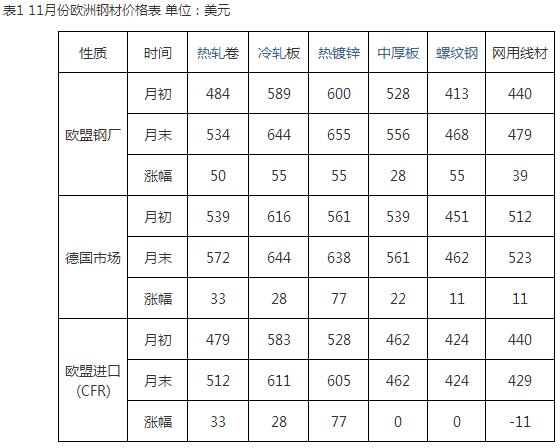 一、十一月份全球區域市場運行特點及分析1、歐洲市場繼續穩步回升11月份,歐洲扁平材市場進入逐步回升階段。歐盟鋼廠10月下旬的提價,對市場形成有力支撐,月初安米和塔塔鋼鐵公司宣布上調扁平材價格,但是鑒于市場走勢不明朗,調價又被收回,但是市場上漲的趨勢已經顯現,中旬之后,塔塔鋼鐵基于焦煤及鐵礦石價格的持續上漲的原因,正式上調板卷價格50歐元。提價后,熱卷出廠價報于550歐元,冷卷和熱鍍鋅卷出廠價報于650歐元。不過提價后,買方市場有所抵制,市場以按需采購為主,貿易商并不基于建庫存,后期市場開始趨于平穩。11月底,歐盟鋼廠的熱卷、冷板、鍍鋅板價格分別為534,644、655美元,比10月份分別回升50美元、55美元、55美元(詳見表1),這是歐洲市場調整以來的持續第四月回升。整體來歐洲鋼廠對于提價較為謹慎,采取穩健的提價策略,預計12月份歐洲扁平材市場繼續穩健上揚。