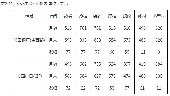 2、北美市場迎來快速回升11月份北美扁平材市場迎來強勢上漲,鋼廠持續上調價格推漲市場。11月北美鋼廠連續開戰了三輪價格上調,推動北美扁平材市場價格快速上漲。月初,美國鋼鐵公司、紐柯、美國AKSteel公司、NLMK美國公司以及安米美國公司等美國鋼廠陸續宣布上調薄板價格30美元,這是自今年6月以來美國鋼廠首次上調薄板價格。此后,又在中旬和下旬分別上調鋼價,11月的3輪提價,累計提價總幅度為100-110美元。鋼廠提價堅決,買方只能接受,三輪提價已基本獲得成功。鑒于近期鋼價節節攀升,安米美國公司并不急于售貨,明年2月的熱卷資源尚未對買主開放。11月底,美國鋼廠的熱卷、冷板、鍍鋅板價格分別為595美元、838美元、838美元,比10月份分別上漲77美元、77美元、77美元(詳見表2)。預計12月份北美鋼廠將會繼續擇機提價,北美市場短期內有望成為漲價節奏最快的區域市場。